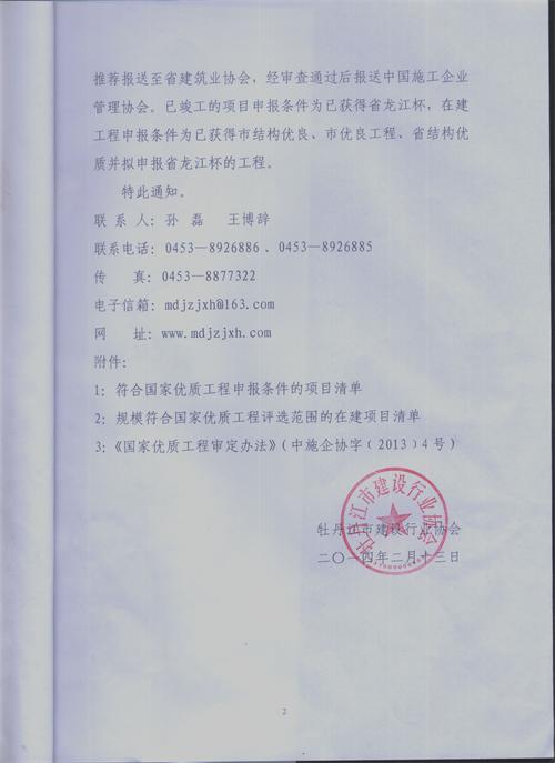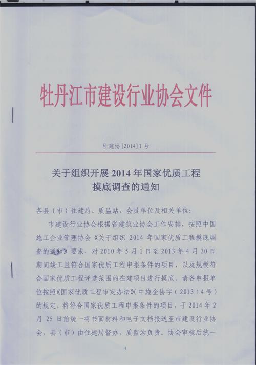 根據(jù)牡建協(xié)【2014】1號(hào)文件《關(guān)于組織開展2014年國(guó)家優(yōu)質(zhì)工程摸底調(diào)查的通知》要求,公司決定在全公司范圍內(nèi)開展此項(xiàng)工作。各單位在2014年2月28日之前把符合申報(bào)條件的工程上報(bào)技術(shù)質(zhì)量部。