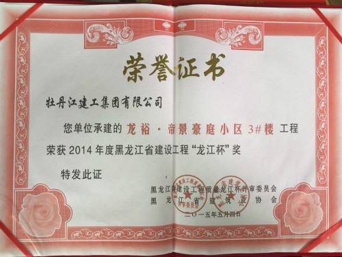 根據(jù)2015年5月4日發(fā)布的黑建協(xié)【2015】5號(hào)文件,即“關(guān)于公布 2014 年度黑龍江省建設(shè)工程質(zhì)量優(yōu)質(zhì)建設(shè)工程獲獎(jiǎng)單位的通報(bào)”,我公司承建的“龍?jiān)?/span>·帝景豪庭小區(qū)3#樓”獲得“龍江杯”獎(jiǎng)