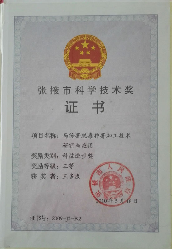 2010年榮獲甘肅省科學(xué)技術(shù)進步三等獎證書